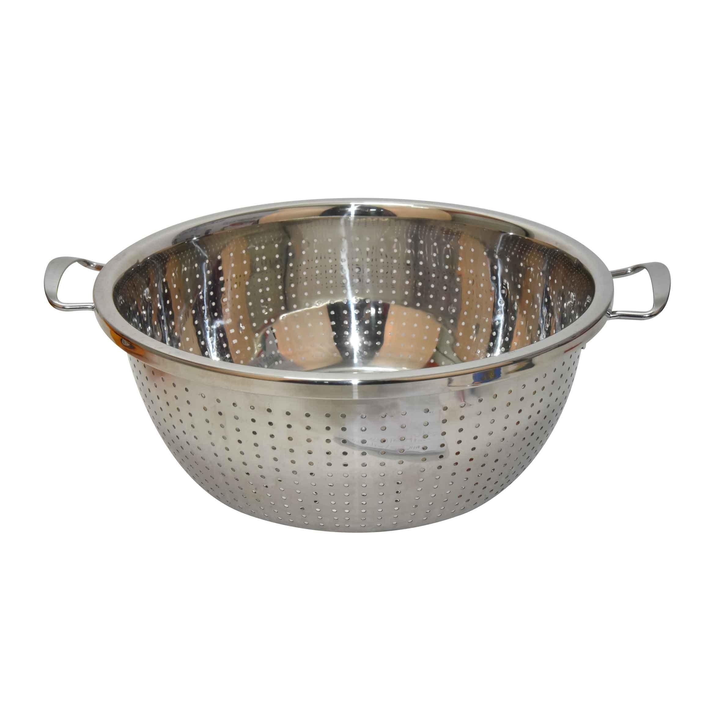 مصفاة عالية الجودة من الفولاذ المقاوم للصدأ تتميز بتصميم مثقب وبمقبضين جانبيين. تقدم هذه الأداة المطبخية المتينة قدرات تصفية ممتازة مع الحفاظ على تصميم عملي ومتعدد الاستخدامات للاستعمال المنزلي والخارجي.